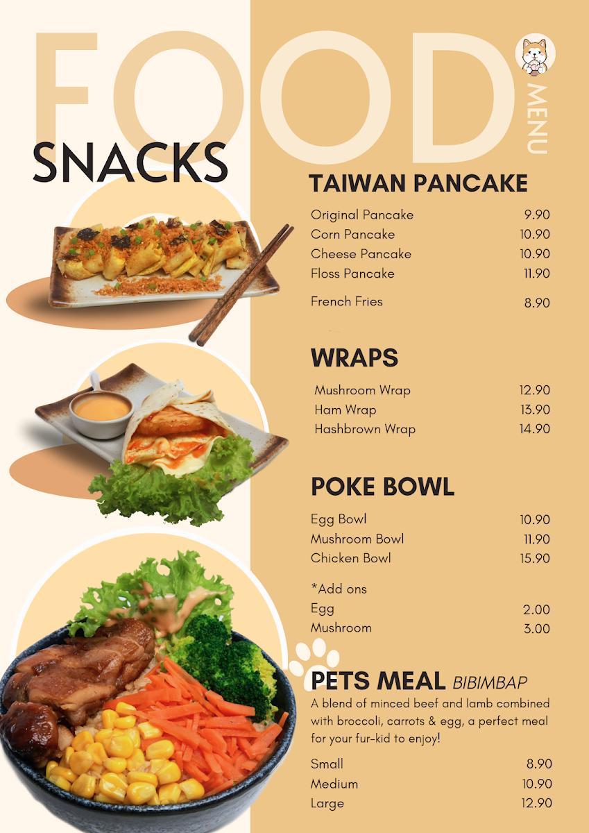 The menu is designed to serve guests who may be visiting while waiting for pet grooming services or simply enjoying a casual visit to the cafe. The variety supports both individual orders and relaxed dining experiences.